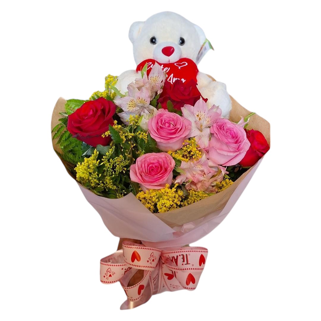 Para tornar este presente ainda mais especial, o buquê acompanha um adorável ursinho de pelúcia segurando um coração, perfeito para transmitir mensagens de amor e ternura. Envolto em papel elegante e finalizado com um laço decorativo com corações, este buquê é a escolha ideal para ocasiões românticas como Dia dos Namorados, aniversários ou simplesmente para surpreender quem você ama.