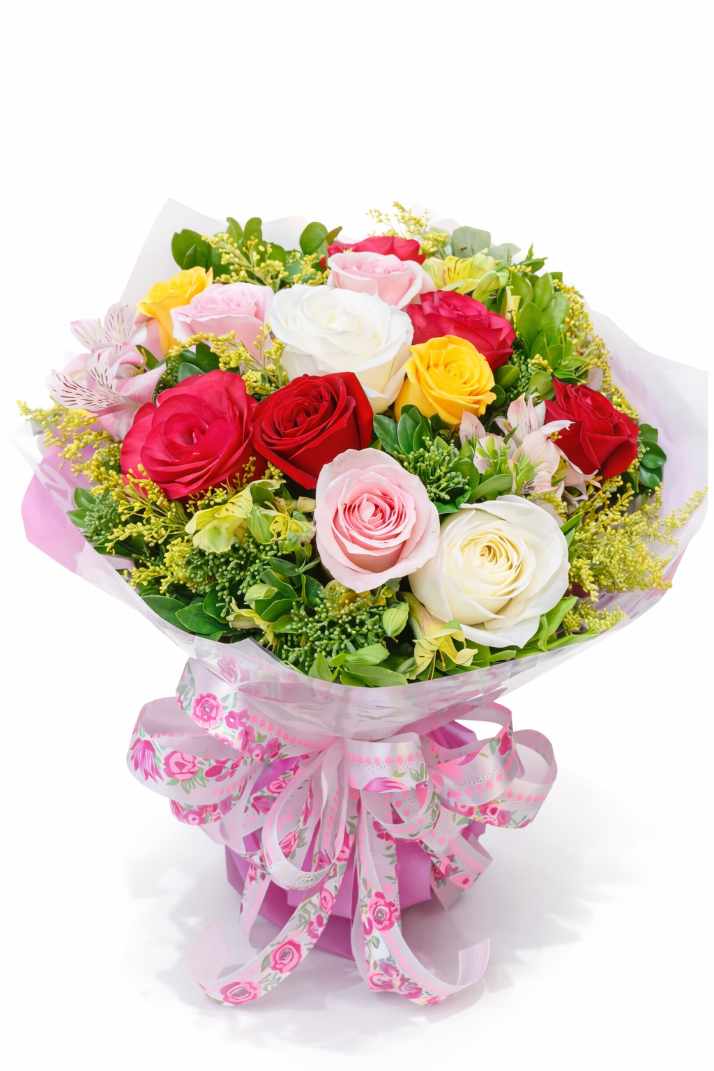 buquê com 2 rosas vermelha 2 amarelas e 2 rosas