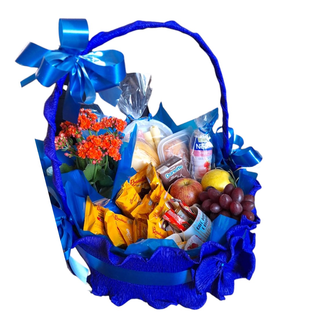 Toda a cesta é cuidadosamente montada em um elegante revestimento azul, finalizada com um laço exuberante, conferindo um toque de sofisticação e carinho ao presente.